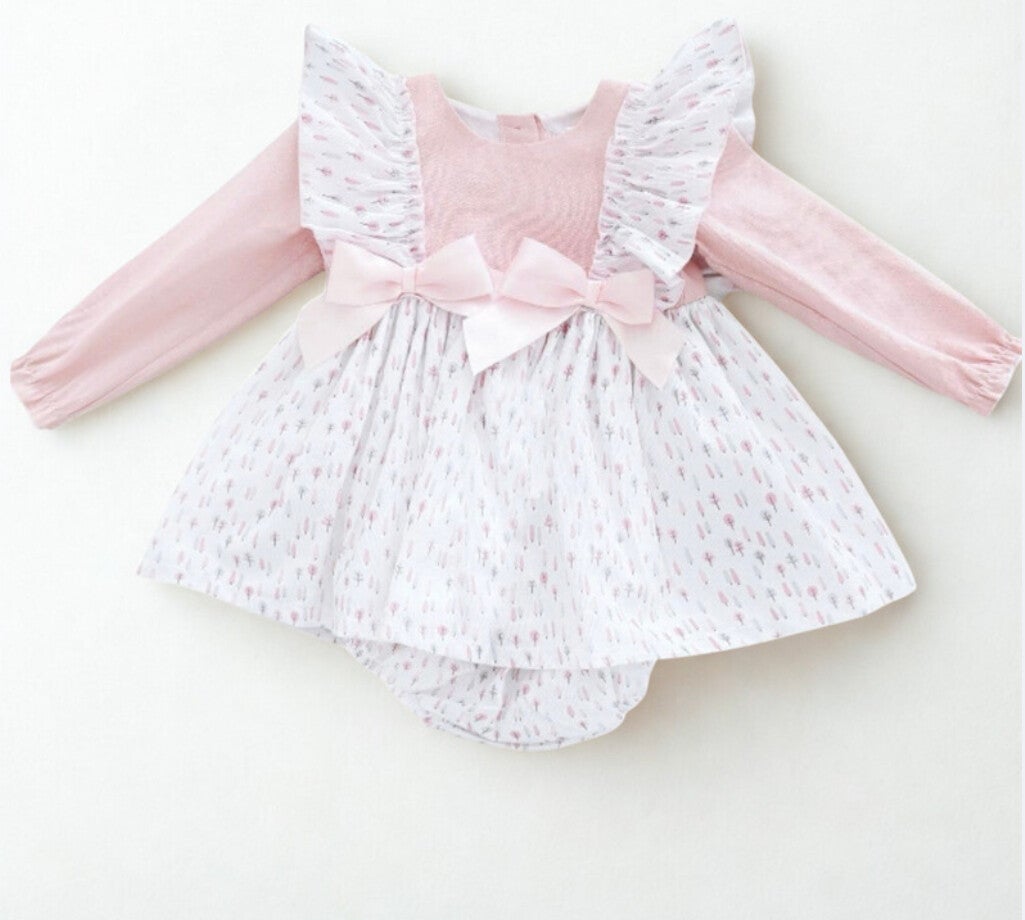 Weeme dusky pink Tree print dress, with frilly shoulders and matching knickers.