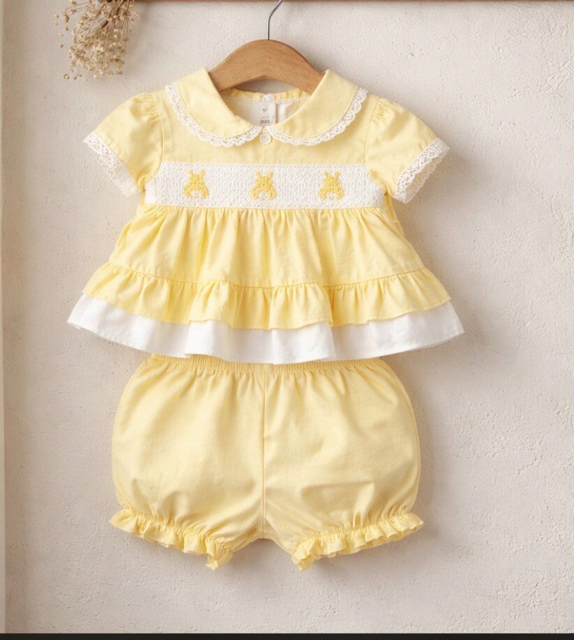 Lemon Smocked Bunny dress with bloomers and matching headband.